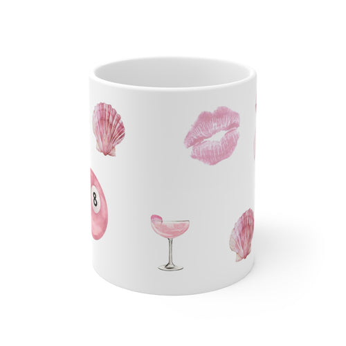 11oz Ceramic Mug — Pink Seashells, Starfish & Cocktail Illustrations